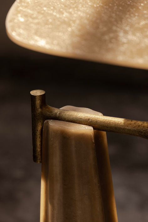Developed with fiberglass and 3D-printed molds, each piece is finished by hand, allowing nuanced textures and slight variances that make every object unique. Visible bronze supports echo an internal skeletal logic, reinforcing a dialogue between structural tension and sculptural form.