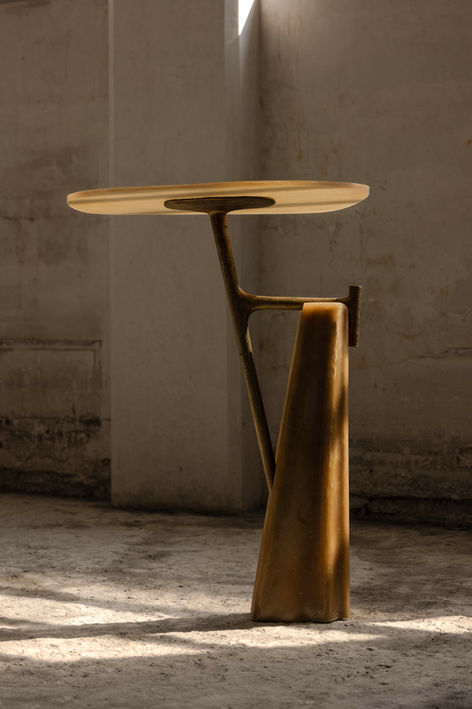 Developed with fiberglass and 3D-printed molds, each piece is finished by hand, allowing nuanced textures and slight variances that make every object unique. Visible bronze supports echo an internal skeletal logic, reinforcing a dialogue between structural tension and sculptural form.