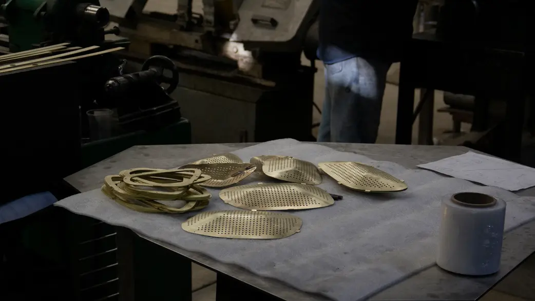 Brass pieces are soldered, patinated, and polished by hand. Some areas are darkened to achieve an aged tone, while others are polished to reflect light. Subtle variations in color and texture result from this process. Each piece is sealed with a thin polyurethane layer for protection, though it’s intended for indoor use.