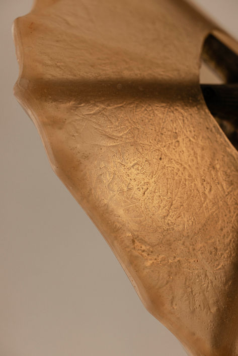 Developed with fiberglass and 3D-printed molds, each piece is finished by hand, allowing nuanced textures and slight variances that make every object unique. Visible bronze supports echo an internal skeletal logic, reinforcing a dialogue between structural tension and sculptural form.